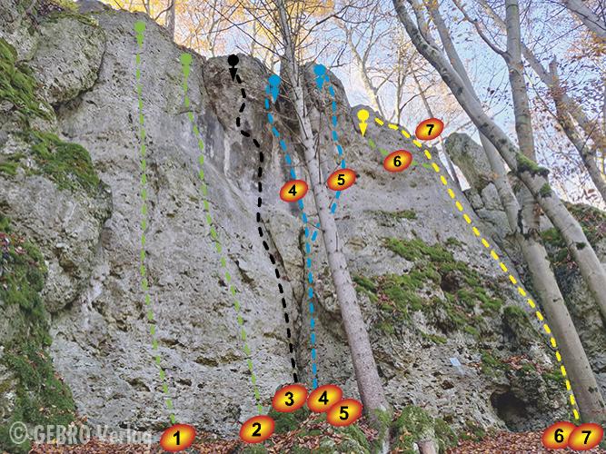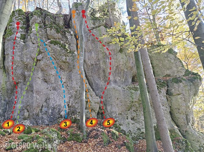 Ergänzende Info: Der Fels wurde von Christian Foos und Jürgen Holz entdeckt. Die Routen 1, 3, 4, 6, 9 und 10 wurden von den beiden erschlossen und erstbegangen.